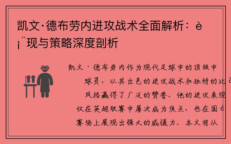 凯文·德布劳内作为现代足球中的顶级中场球员,以其出色的进攻战术和独特的比赛风格赢得了广泛的赞誉。他的进攻表现不仅在英超联赛中屡次成为焦点,也在国际赛场上展现出强大的威慑力。本文将从四个方面对凯文·德布劳内的进攻战术进行全面解析,包括他的定位与角色、传球与视野、进攻组织与创造力、以及与前锋的配合与默契。通过对这四个方面的详细剖析,我们可以更好地理解德布劳内在比赛中的表现和策略,并探讨他如何通过个人能力与战术素养来提升球队的整体进攻水平。